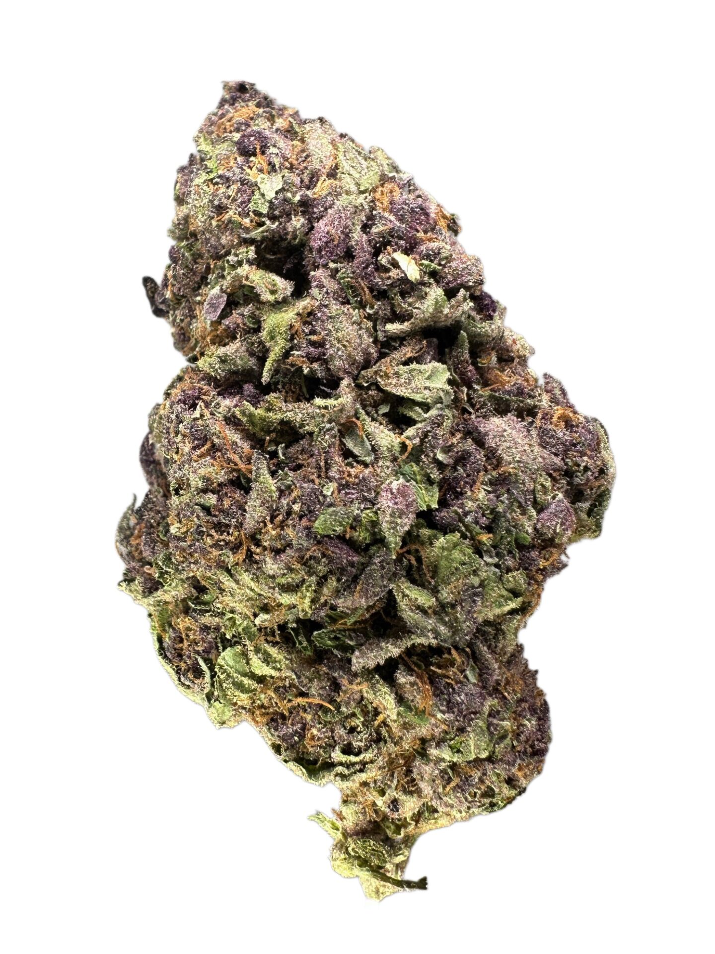 Buds are medium-sized with a mix of green and light purple hues. A moderate dusting of trichomes and orange hairs gives it a typical mid-tier hybrid look.